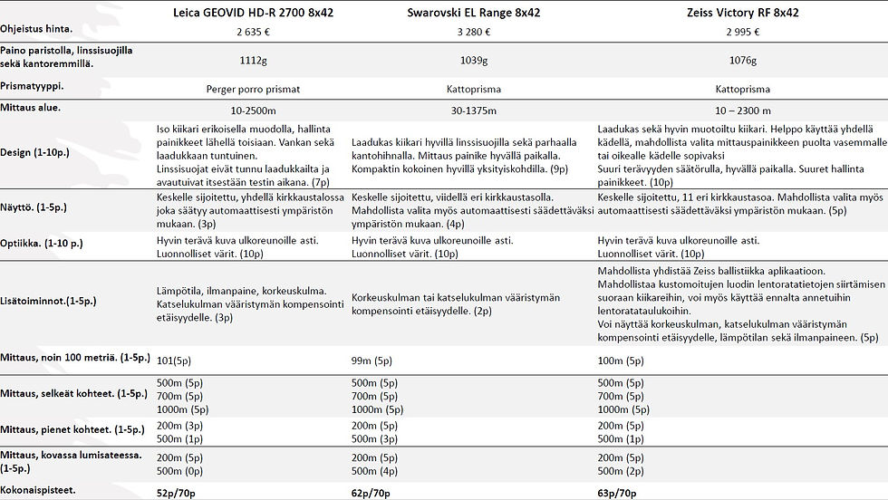 Kaikki testit jotka suoritin on pisteytetty, alla olevassa taulukossa pääsette lukemaan miten minä pisteytin jokaisen kiikarin.
